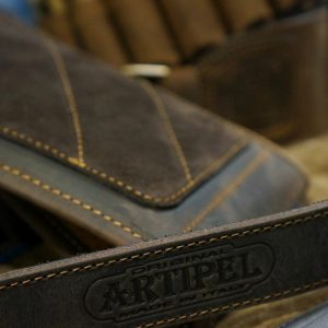 Remeň na zbraň s vodeodlnou úpravou a efektom teľaciny. Je kompletne podšitý nekĺzavým velúrom. Ručne prišité pútka s prackou.